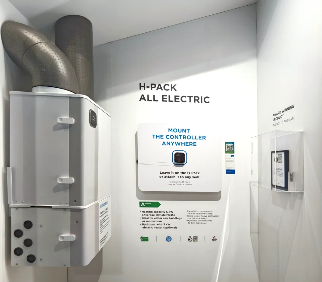 Anche grazie all’utilizzo del gas R290, il sistema è in grado di raggiungere temperature di mandata elevate, fino a 75°C, che possono arrivare fino a 90°C nelle configurazioni ibride: nel caso di riqualificazioni e ristrutturazioni questo permette l’utilizzo anche in accoppiata ai radiatori tradizionali. Il sistema di gestione dell’aria tramite condotti di aspirazione ed espulsione è la chiave di volta della proposta, che apre la possibilità di installazione in locali tecnici, garage o vani di servizio. Unica particolarità da tenere in considerazione è la dimensione di tali condotti: in base a quanto abbiamo visto in fiera sembrano necessari almeno 20cm di diametro per ciascuno. Anche a livello di ingombri, il prodotto è, naturalmente, più grande di una classica caldaia.